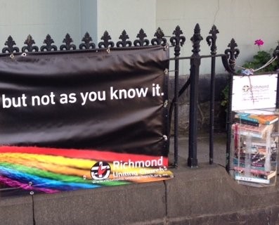 This photograph is taken just outside the Uniting Church of Australia building. From memory, the rainbow banner said something like, “Church … but not as you know it.”