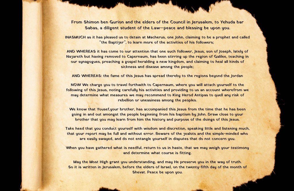 and whereas it has come to our attention that one such follower, Jesus, son of Joseph, lately of Nazareth but having recently removed to Capernaum, has been stirring up the region of Galilee, teaching in our synagogues, preaching a gospel heralding a new kingdom, and claiming to heal all kinds of sickness and disease among the people;